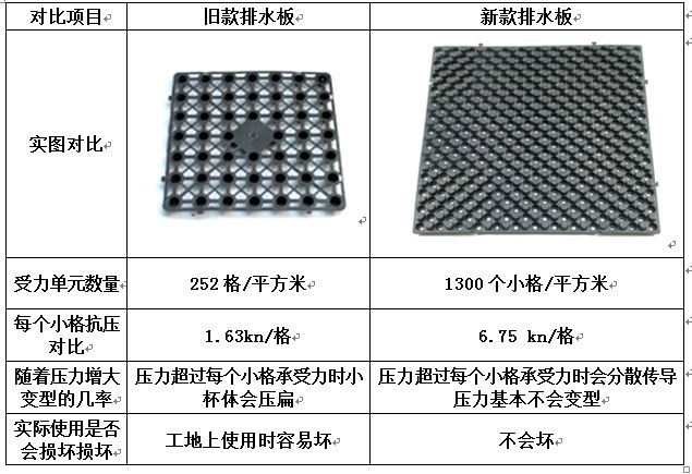 排水板種類及作用目前國內建筑地下室頂板或屋頂排水產品中,塑料排水板基本已經取代了鵝軟石或陶粒,但在地下室頂板使用上,往往需要承載大量的泥土還有上面的景觀材料及建筑體,面臨著承載能力不足,把普通排水板壓壞壓扁,大大減低了其排水效果。該產品就是在這基礎上改進而來的,通過分散傳導壓力,把回填土的壓力直接傳遞到頂板上,解決了抗壓不足的問題。同時通過提高排水孔位置,縮小排水孔面積,減少根系穿透的幾率,更好的保護地下室頂板。一、傳統排水板的概況及缺點: ![]() 410*410*25 ![]() 33*33*25小杯 ![]() 33*33*25大杯 這些排水板在回填土不多,不需要抗很大壓力時能起到很好的排水作用,但是其自身結構上的缺陷導致抗壓能力很底,如果需要回填比較多,就很容易壓壞: 傳統排水板的結構壓力圖 1、承載能力底,容易被壓扁而散失排水功能; 2、植物根系容易穿透而破壞排水效果及影響頂板壽命。 二、改進型排水板 針對傳統排水板的缺點,我公司經過長期的不懈努力,解決了以上連個不足,使得排水板的使用效果有明顯的提高。這款排水板有個傳導壓力的設計,隨著壓力增大泥土壓到反向的凸臺直接傳導到頂板上面,而不會破壞底下的排水間隙。所以該款排水板理論上是無限抗壓的。 新型排水板500*500*25 注: 代表方面 代表正面 代表排水孔 改進后的結構: 1、把主要壓力直接傳遞到頂板上,抗壓能力提高。 2、減少根系穿透。 排水板壓力對比圖